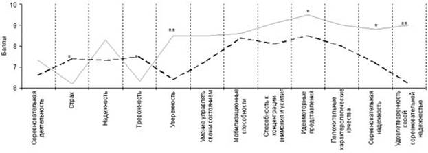 Рис. 1. Изменение профиля психической готовности высококвалифицированных спортсменов под влиянием систематического ментального тренинга