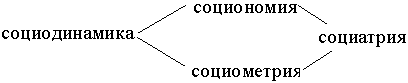 В социометрии применяются социометрические методы, в социодинамике - методы исследования взаимодействия, “игры ролей”; социатрия использует групповую психотерапию, особенно психодраму и социодраму. Связи между отдельными элементами Морено представляет таким образом: