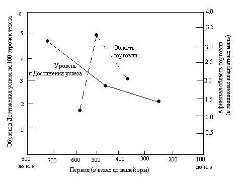 Историки согласны, что период с 475 по 362 гг. до н. э. был пиком коммерческого успеха Древней Греции, не считая период экономического роста при Александре позже; количественную поддержку это единодушное мнение получило благодаря составлению карт тех районов, с которыми Древняя Греция торговала в 6, 5 и 4 веках до н. э. (Берлю, 1956). Эти карты можно было легко составить, так как Греция в основном экспортировала излишки вина и оливкового масла в глиняных кувшинах, которые потом опустошались и выбрасывались за ненадобностью. Археологи установили места, где были найдены остатки подобных кувшинов и определили век изготовления по отметкам на них. Определение расположения останков греческой утвари дает приблизительное представление о размере торгового рынка, который, как отмечают историки, в пятом веке пережил невероятный подъем. Диаграмма 11.1 схематически изображает средний уровень п Достижения успеха на 100 строчек текста в ранний, средний и поздний периоды. Заметьте, что п Достижения успеха был наибольшим до расширения торговли, значительно упала в период наивысшего экономического развития, таким образом, предвещая неизбежный экономический спад. Общая гипотеза подтверждает, что высокая п Достижения успеха предшествует экономическому росту, а низкий уровень коллективной п Достижения успеха предшествует экономическому спаду.