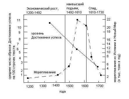 Кортес (1960, в книге МакКлелланда, 1961) исследовал художественную испанскую литературу до, во время и после максимального расширения торговых отношений с Новым миром. Опять уровень п Достижения успеха измерялся большим объемом литературного материала: около 100.000 слов из 56 произведений разных авторов всех трех периодов. Как показывает Диаграмма 11.3 Он получил ту же зависимость, что и Берлю для Древней Греции: высокий уровень п Достижения успеха перед периодом быстрого расширения торговли с Новым миром упал незадолго до краха испанской экономической империи. Путешествия за новыми открытиями были организованы страной с высоким уровнем п Достижения успеха, она заряжала энергией для поиска новых экономических преимуществ Нового мира. И опять процветание - возможно, накопление золота – понизило последующий уровень п Достижения успеха.