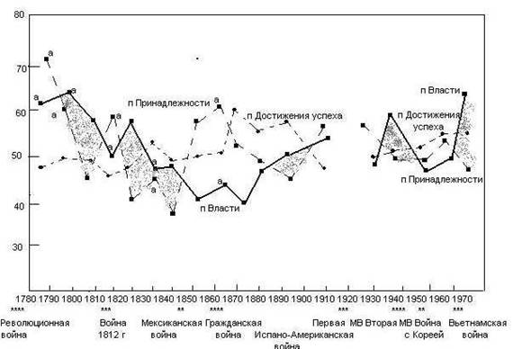 Тщательно сравните американских президентов данных десятилетий (см. Таблицу 8.8) с мотивационными уровнями этих декад, установленными из художественной литературы (Диаграмма 11.9). Сколько соответствий вы обнаружили? Попытайтесь объяснить полученные результаты. Проследите также за систематическим лидерством и отставанием: мотивационные уровни президентов регулярно предшествуют или следуют за мотивационными уровнями художественной литературы? Вы можете провести также более детальный анализ при сравнении мотивационных уровней президентов с мотивационными уровнями разных видов литературы (см. МакКлелланд, 1975).
