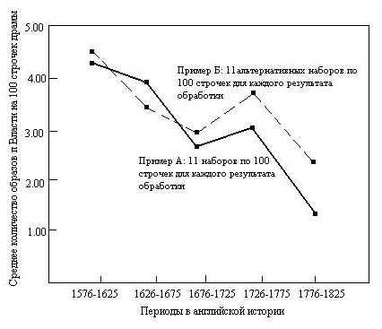 Сравнение измерений п Власти, полученных из двух образцов непрерывного текста драмы в разные периоды английской истории (по МакКлелланду, 1975).