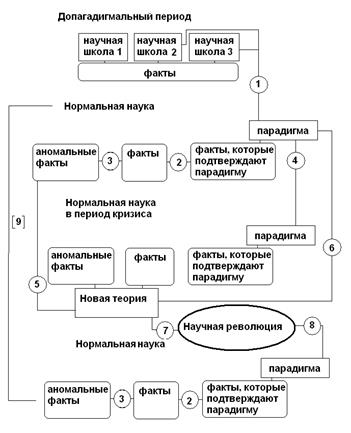 Зрелая наука в своем развитии последовательно проходит несколько этапов. Период нормальной науки сменяется периодом кризиса, который либо разрешается методами нормальной науки, либо приводит к научной революции, которая заменяет парадигму. С полной или частичной заменой парадигмы снова наступает период нормальной науки.