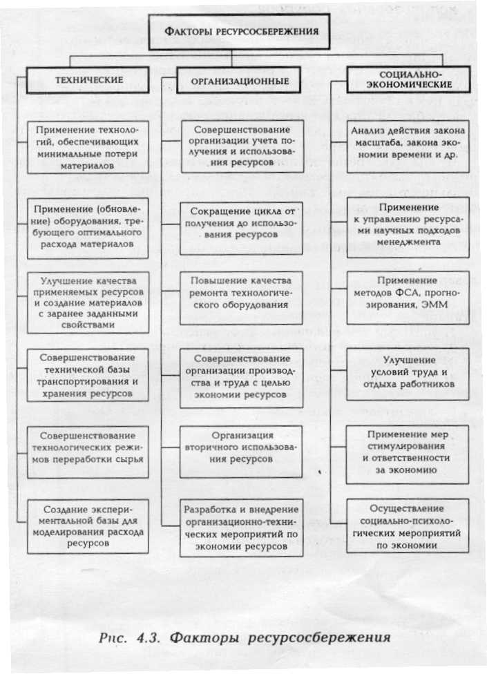Основные факторы ресурсосбережения приведены на рис. 4.3. Разработка конкретных мероприятий по реализации перечисленных факторов позволит улучшить основные и дополнительные показатели ресурсоемкости отдельных товаров и производств в целом.