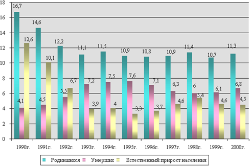 В 2000 году в Российской Федерации продолжился (начавшийся с 1992г.) процесс сокращения населения. Причем темпы снижения численности россиян на протяжении последних шести лет (1995 - 2000гг.) оставались достаточно стабильными и составили около 0,4% в среднем за год (500 тыс. человек). Определяющим фактором уменьшения остается естественная убыль, которая сохраняет устойчивый и долговременный характер.