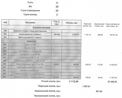 Компания "PZU Украина" предлагает несколько программ страхования, которые являются совмещенными: как программы по накоплению, пенсионному страхованию, так и страхованию жизни. Наиболее выгодная на данный момент программа "Актив". Краткое описание программы. Застрахованными лицами могут быть физические лица от 16 до 75 лет. Страховым случаем является смерть застрахованного в период действия договора или дожитие до окончания срока действия договора. Максимальный срок действия договора 30 лет. Инвестиционный годовой доход 4%, также предусматривается дополнительный инвестиционный доход, по итогам 2009 года он составил 19%. Взносы можно оплачивать 1, 2, 4 раза в год. Также предусмотрены дополнительные страховые покрытия, такие как несчастный случай, инвалидность, травматизм. Доплата за них рассчитывается исходя из страховой суммы. Расчет сумм страхования приведен на рисунке 1. Рисунок 1 представляет собой таблицу-калькулятор, которая рассчитывает ежегодный платеж исходя из начальных условий. Начальными условиями являются возраст (26 лет), пол (женский), срок страхования (максимальный 30 лет), группа риска (2 –частный предприниматель), страховая сумма (100 тыс. грн.). По основной программе ежегодный платеж будет составлять 2276,7 грн. Выбрав дополнительные покрытия (по 50 тыс.) такие как комплексное покрытие (I, II) по несчастному случаю и инвалидность 1 и 2 групп по любой причине,получаем дополнительные суммы в размере 450 и 386,25 грн соответственно. Общая сумма составляет 3112,95 грн.