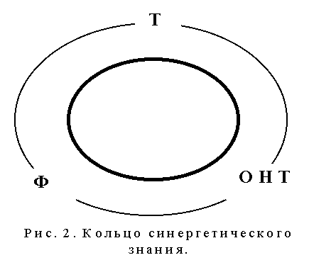 В то же время каждый из трех элементов кольца состоит из множества других элементов. Например, Т – набор из десятков теорий – физических, химических, биологических, социальных (экономических, культурологических), выражающих взаимопревращение хаоса и порядка. ОНТ – набор из нескольких общенаучных теорий (концепций) – Хакена, Пригожина, математических теорий, логических теорий, виталистических учений, телеологических и т. п. Ф – также не единственна. Это целая область различных онаученных мировоззренческих учений, образы которых созвучны даосизму, буддизму, индуизму, эзотерике, христианству, пифагореизму, платонизму, аристотелизму, а также в идеям Декарта, Лейбница, Канта, Гегеля, Соловьева, Флоренского, Хайдеггера и других мыслителей.