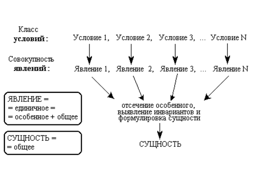 Познание сущности идет от явлений, путем отсечения второстепенного, особенного, к выделению общего , т.е. того, что остается неизменным для всех явлений данной совокупности (рис. 2). Сущность как общее для всех явлений отражает глубинные связи иотношения. Процесс поиска сущности сложен и нет каких-либо рецептов для прямого перехода от явлений к сущности.