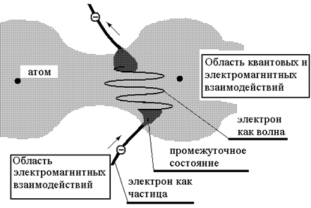 Пусть теперь электрон движется в области квантовых и электромагнитных взаимодействий, т.е. между атомами. Благодаря взаимодействию свойства электрона (масса, структура и т.д.) будут напоминать свойства волны. Схема, изображенная на рис.4, есть только иллюстрация. Если мы придерживаемся научной логики, мы не должны эклектически объединять в единый узел взаимоисключающие свойства. Всегда необходимо определять границы применимости понятий, т.е. условия, при которых возникают и исчезают те или