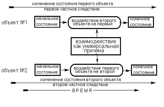 Универсальной причиной в этой модели выступает взаимодействие . Следствием взаимодействия является изменение состояний взаимодействующих объектов. Изменение состояния любого из взаимодействующих объектов представляет собой частное следствие .