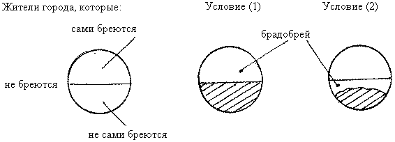 Рассмотрим сначала действие условия (1). Пусть брадобрей бреет всех тех, которые не сами бреются, то есть всю нижнюю половину эллипса (штриховка отмечает клиентов брадобрея). Но условие (1) разрешает ему брить и того, кто сам бреется, то есть самого себя. Условие (1) разрешает ему расположиться в верхней половине эллипса, где жители сами бреются, и брить себя там. Это показано на среднем рисунке.
