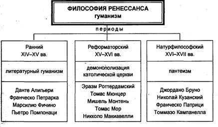 Поворот к антропоцентризму нельзя понимать упрощенно как утверждение человека главным объектом любого познания или как некое выражение материалистических воззрений. Суть в том, что гуманизм Ренессанса проявлялся в революционных идеях, обращенных на внутреннюю, земную «божественность» человека, в отказе от внешней «институциональной» божьей истины, в привлечении человека к жизненной активности, в утверждении веры человека в себя. Но и это новое, несомненно прогрессивное, будучи исторически обусловленным, могло про явиться лишь в той или иной форме, определяемой рамками религии. Реализация гуманизма предполагает освоение достижений культурного богатства прошлого, поэтому вновь пробуждается интерес к многоликому богатству древней философии. Вновь и по-новому открывается Платон, Аристотель, ряд других философов и школ античности (см. схему).