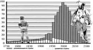 На прикладі Франції, населення якої вивчено найбільш точно, добре видно закономірності: з 1750 р. дотепер крива спочатку плавно росте (приріст 0,5%), проходить через максимум і починає неухильно знижуватися. У всіх країнах крива росту має максимум, причому максимуми в різних країн - у різний роки: у розвитих країн у 1950-і роки, в інших - на 50 років пізніше. У Росії самий різкий приріст (2%) був на початку ХХ століття, у країн, що розвиваються - зараз (3-4% у рік). І крива для росту населення усього світу виглядає точно так само - після росту різкий спад, а потім стабілізація. Це явище дістало назву демографічного переходу .