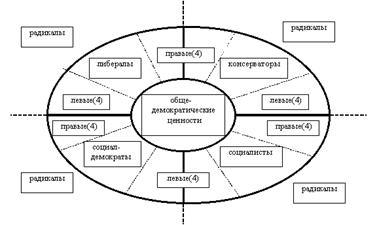 К этим, в общем-то, достаточно близким к привычным, определениям “левизны” и “правоты” можно добавить еще одно, которое выражало бы отношения внутри каждого сектора политического поля между “фракциями” или различными вариантами одной идеологии. Так уже упомянутых “консервативно настроенных” либералов можно определить как “правых(4) либералов”. А либералов, близких по взглядам к социал-демократам - как “левых(4) либералов”. Таким же образом можно выделить левое и правое крыло в каждой из трех оставшихся идеологий.