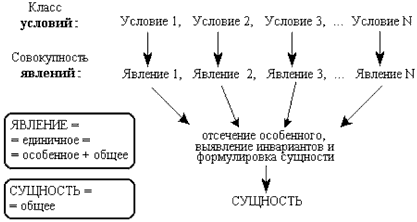 Познание сущности идет от явлений, путем отсечения второстепенного, особенного, к выделению общего, т.е. того, что остается неизменным для всех явлений данной совокупности (рис.2). Сущность как общее для всех явлений отражает глубинные связи и отношения. Процесс поиска сущности сложен и нет каких-либо рецептов для прямого перехода от явлений к сущности.