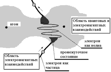 Пусть теперь электрон движется в области квантовых и электромагнитных взаимодействий, т.е. между атомами. Благодаря взаимодействию свойства электрона (масса, структура и т.д.) будут напоминать свойства волны. Схема, изображенная на рис.4, есть только иллюстрация. Если мы придерживаемся научной логики, мы не должны эклектически объединять в единый узел взаимоисключающие свойства. Всегда необходимо определять границы применимости понятий, т.е. условия, при которых возникают и исчезают те или иные свойства*. Возможно, такой подход позволил бы освободиться от вероятностной интерпретации функции |Ψ|2 и перейти от квантовой механики точечных частиц к механике протяженных частиц. Эта идея имеет право на существование и проверку.