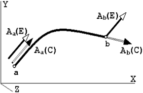 Мы предлагаем другую процедуру сравнения векторов в криволинейном пространстве. Мы выбираем в точке a два равных по величине и направлению вектора Aa (C) и Aa (E). Теперь мы перемещаем оба вектора в точку b. Вектор Aa (E) принадлежит евклидовому пространству. Он будет перемещаться параллельно самому себе: Aa (E)=Ab (E). Второй вектор будет перемещаться «параллельно самому себе» в пространстве C. Сравнивая вектора Ab (E) и Ab (С) в точке b, мы можем определить величину кривизны пространства C, как показано на рис.5.