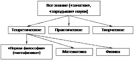 Одна из первых попыток систематизации и классификации накопленного знания (или "зачатков", "зародышей" науки) принадлежит Аристотелю[1] (рис. 1). Все знание – а оно в античности совпадало с философией – в зависимости от сферы его применения он разделил на три группы: теоретическое, где познание ведется ради него самого; практическое, которое дает руководящие идеи для поведения человека; творческое, где познание осуществляется для достижения чего-либо прекрасного.