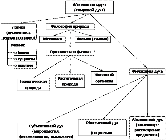 Философия природы подразделялась далее на механику, физику (включающую и изучение химических процессов) и органическую физику, которая последовательно рассматривает геологическую природу, растительную природу и животный организм. Указанное подразделение содержит, по крайней мере, две важные и позитивные идеи : направленность против механицизма (т.е. стремления только с помощью законов механики объяснить все явления действительности, включая человека и общество); подчеркивание иерархичности – расположение областей (сфер) природы по восходящим ступеням от низшего к высшему. Эти идеи были ничем иным, как "догадками" о взаимосвязанных формах движения материи и о классификации естественных наук по этому основанию – что потом сделал Ф. Энгельс[4] .