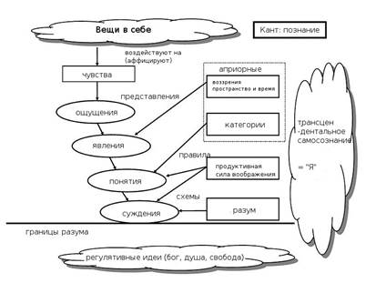 Бесспорным достижением теории познания Канта был новый взгляд на соотношение созерцания и интеллекта. «Ни одну из этих способностей нельзя предпочесть другой. Без чувственности ни один предмет не был бы нам дан, а без рассудка ни один нельзя было бы мыслить. Мысли без созерцания пусты, созерцания без понятий слепы». Их соединение, по Канту, и есть полнота возможного познания, которое представляет собой априорное упорядочение явлений, но не проникновение в их сущность. Итог соединения чувственных материалов познания, упорядоченных посредством априорных механизмов созерцательной и рассудочной деятельности – это опыт. Научное знание представляет собой синтез чувственности и рассудка. Логические формы, которые служат основой синтеза Кант, вслед за Аристотелем называет категориями. Только потому, что они существуют, возможно, по Канту, чистое естествознание.