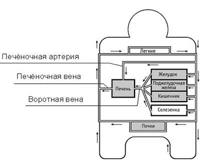 Судьба попавших в стенки кишечника органических соединений. Из стенок кишечника органические соединения переправляются к клеткам тела двумя путями. Первый – непосредственный путь, при котором они из стенок кишечника поступают в сосуды лимфатической системы, по ним попадают в большой кровеносный круг и через него разносятся по всему телу. Второй – опосредованный путь, при котором они из стенок кишечника попадают в капилляры кровеносной системы, а далее – в воротную вену и через неё – в печень. В печени они проходят дополнительную обработку, после чего по печёночной вене переправляются в большой круг кровеносной системы и через него разносятся по всему телу. Рассмотрим оба пути продвижения органических соединений подробнее.