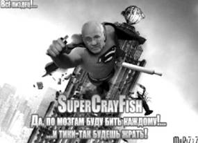 Илл. 48. Креатив «SuperCrayFish» («СуперРак»), в основе которого постер фильма «Супермен возвращается» (2006). Использована фотография лица Рака, в руки герою вложены скалка и детский крем «Тик-так», которые Рак грозил применить против пранкеров; в качестве слоганов