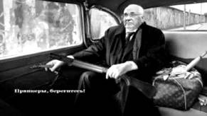 Илл. 49. Креатив «Пранкеры, берегитесь», отсылающий к стилистике гангстерского кино. Использована фотография лица Рака, из сумки главного героя торчит скалка и счет за телефонные переговоры