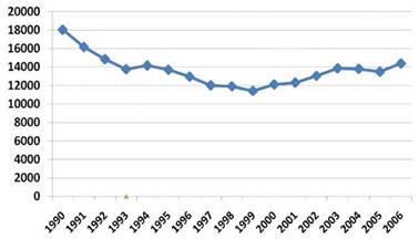 Изменившийся за последние 1,5 десятилетия взгляд населения на традиционный институт семьи повлекший за собой тенденцию к более позднему вступлению мужчин и женщин в брак, высокая частота разводов, увеличение числа лиц фертильного возраста, проживающих одиноко, внесли вклад в снижение рождаемости в стране. Этому способствуют также изменившееся социальное благополучие основной массы граждан и повышение требований населения к уровню обеспечения и воспитания ребенка. В Белгородской области в течение периода 1990-2006 г.г. абсолютное число живорождений сократилось на 20,3±0,3%, что наглядно демонстрирует рис.2. Следовательно, за указанный период не родился каждый пятый гражданин области. Показатель рождаемости (на 1000 населения) снизился с 12,2±0,1%о до 9,5± 0,1%о (Р<0,001), показатель естественной убыли населения на каждую 1000 человек усугубился с 0,6 до 5,8 (в 9,7 раза). Однако в последние годы эти показатели улучшились в сравнении с 2002 годом, когда рождаемость составляла 8,7%, а естественная убыль - 7,6.