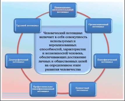 Поэтому представляет интерес проследить изменение структуры человеческого потенциала во временном аспекте. Основой дальнейшего исследования является предложенная автором концепция структуры человеческого потенциала [1, с. 171—181], включающая следующие компоненты (рис. 1).