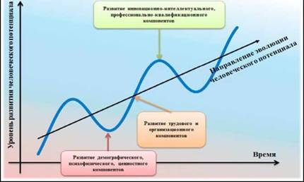 Смена отдельных этапов эволюции человеческого потенциала обусловлена цикличностью развития экономики. В периоды экономических кризисов и депрессий наибольшее значение придается развитию демографического, психофизического и ценностного компонентов. В периоды оживления — развитию трудового и организационного компонентов, а на этапе экономического подъема — инновационно-интеллектуального и профессионально-квалификационного. Причем речь идет как о малых, так и в больших экономических циклах.