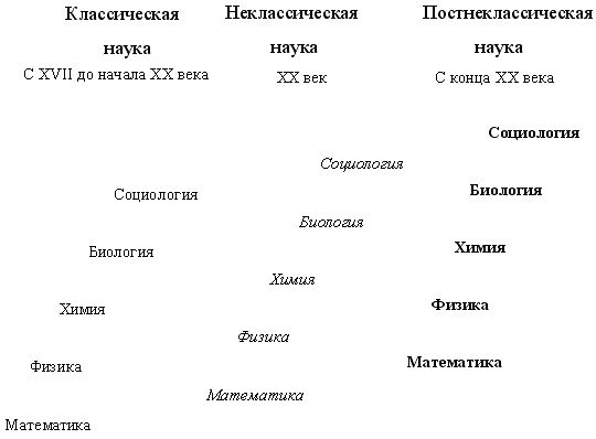 При смене типов научной рациональности лестница наук (схема 1) в основном сохранила состав и взаимное расположение составляющих её элементов (наук), и может показаться, что она осталась неизменной. Однако на самом деле при смене парадигм в развитии наук происходит разрыв и скачок в новое качество, и хотя названия наук сохранились, сами науки в корне изменились. "Неклассику от классики, как известно, отделяет пропасть: мировоззренческий, общекультурный барьер, несовместимое качество мысли" [31, 34]. Попытку отобразить изложенную закономерность представляет собою схема 2. В ней представлены скачки при смене парадигм, а изменением шрифта показано, что науки с одинаковыми названиями принципиально различны.