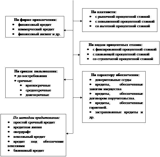 - проклассифицировать кредиты по разным характеристикам: по форме, по платности, по видам процентных ставок, по срокам пользования, по характеру обеспечения и т.п.;