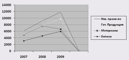 Величина запаса материалов за отчетный период развивалась динамично, а именно сделав резкий скачок в 2008 г. столь же резко упала в 2009 г. Снижение величины материальных запасов привело бы к ускорению оборачиваемости оборотных активов в конце анализируемого периода, если бы не резкое увеличение объема готовой продукции.