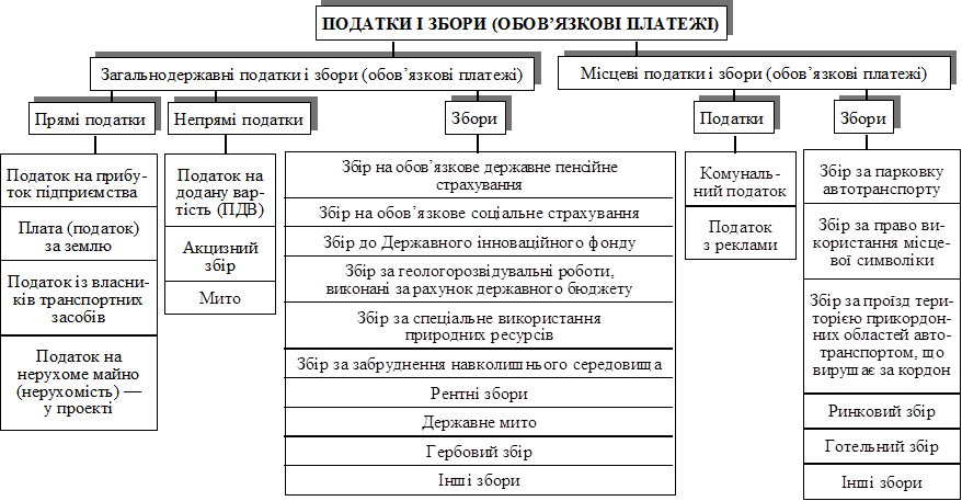 Підприємства — суб’єкти господарювання повинні сплачувати загальнодержавні, а також місцеві податки і збори. Загальнодержавні податки і збори включають: