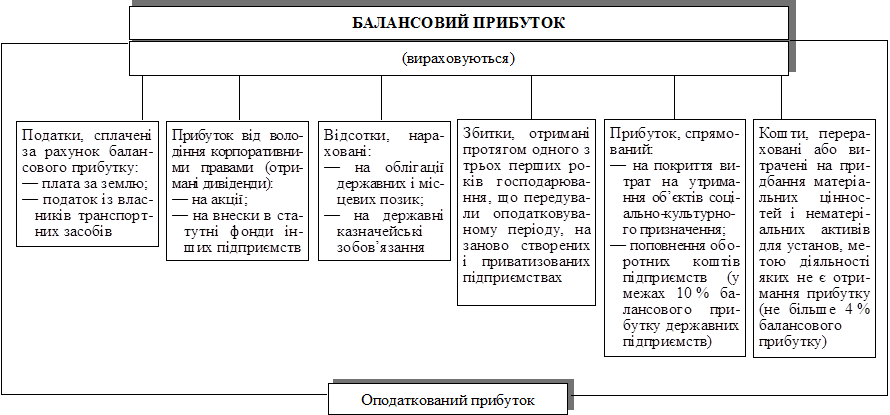 Рис. 1.3. Схема визначення оподаткованого балансового прибутку підприємства відповідно до Закону України «Про оподаткування прибутку підприємств» від 28 грудня 1994 р.