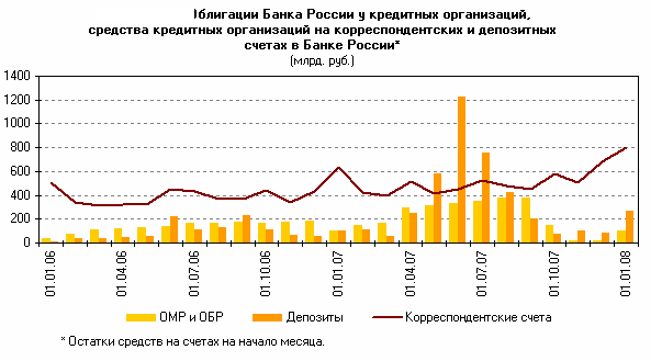 С 1.11.2007 г. коэффициент для расчета усредненной величины обязательных резервов был повышен с 0,3 до 0,4, что, в частности, обусловило рост суммы обязательных резервов, в среднем поддерживаемых кредитными организациями на корреспондентских счетах и корреспондентских субсчетах в Банке России с 96,8 млрд. руб. в октябре до 124,1 млрд. руб. в декабре (в январе 2007 г. - 46,5 млрд. руб.).