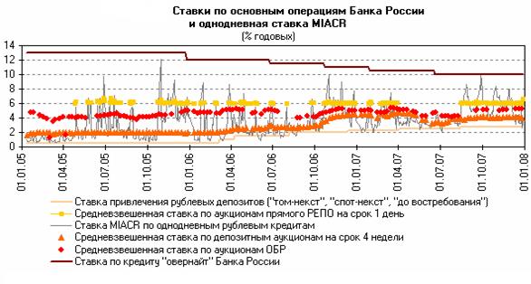 В IV квартале 2007 г. фиксированные процентные ставки по депозитным операциям, проводимым на стандартных условиях «том-некст», «спот-некст» и «до востребования», составляли 2,75% годовых, на стандартных условиях «1 неделя», «спот-неделя» - 3,25% годовых (в 2007 г. указанные ставки повышались дважды на 0,25%). В рассматриваемый период средневзвешенные процентные ставки по депозитным аукционам на срок 4 недели находились в диапазоне 4,01-4,19% годовых, а на срок 3 месяца - 4,90-4,95% годовых (в целом в истекшем году - 3,20—4,76 и 3,79-5,10% годовых соответственно).