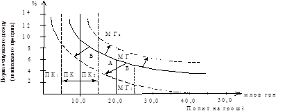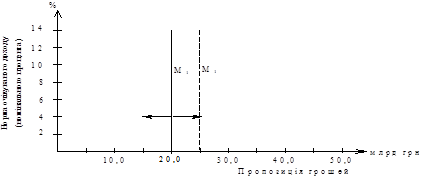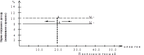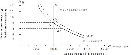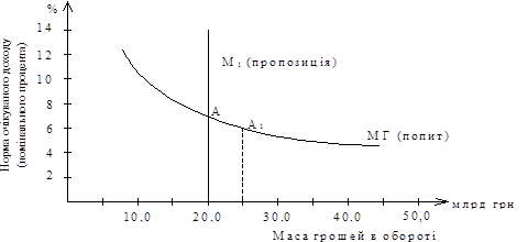 При незмінному попиті на гроші точка перетину кривих попиту і пропозиції зміститься вниз вправо по кривій МД у позицію A1 яка й визначить новий рівень рівноваги на грошовому ринку: ставка процента знизиться до 6%, маса грошей збільшиться до 5,0 млрд. грн. Тільки за цих параметрів кон'юнктура грошового ринку стабілізується і встановиться нова рівновага попиту і пропозиції в точці A1 .