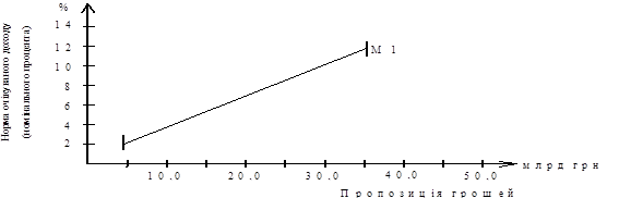 Графічне зображення пропозиції грошей. Оскільки пропозиція грошей як явище екзогенне формується насамперед банківською системою, графічне зображення кривої пропозиції в системі координат буде залежати від тактичних цілей грошово-кредитної політики. Якщо тактичною ціллю цієї політики є підтримання на незмінному рівні маси грошей в обороті при вільному русі процентної ставки, то крива пропозиції грошей матиме такий вигляд (рис. 1.2).
