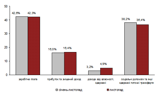 Рис. 3.2. Структура доходів населення України у січні–листопаді 2008 року.