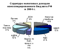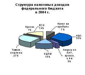 Наиболее важными налогами для бюджетной системы России, по-прежнему, остаются НДС, таможенные пошлины и налог на прибыль. Для федерального бюджета наибольшее значение имеют первые два налога, поскольку на их долю в 2004 г. приходилось более 60% налоговых доходов. Активный рост поступлений по большинству налогов и сбором, прежде всего, от таможенных пошлин и НДПИ, безусловно, был вызван небывалым улучшением внешнеэкономической конъюнктуры.