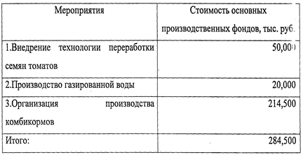 При переработке томатов на томатный сок и томатную пасту образуются томатные выжимки, содержащие семена томатов. Эти семена можно переработать и получить томатно-маслянный экстракт. При производстве 11,25 т/год прибыль от реализации продукции составит 368,55 тыс. руб., себестоимость 307,13 тыс. руб.. численность увеличится на восемь человек, фонд заработной платы на 28,8 тыс. руб. Инвестиции составят 50 тыс. руб. и окупятся через восемь месяцев.