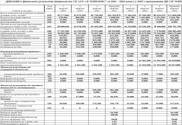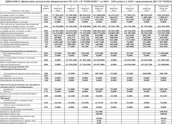 Таблиця Б.4 – Динаміка характеристик фінансових результатів СП ЗАТ з ІІ „КИПАРИС” (2002) та зведених фінансових результатів + СП „КИПАРИС-Т”(2003)