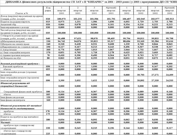 Таблиця Б.3 – Поквартальна динаміка вертикальної структури статей звіту(Форма 2) про фінансові результати СП ЗАТ з ІІ „КИПАРИС” у 2001 –2002 роках (відносно сум чистого валового доходу від реалізації)Таблиця Д.9 – Динаміка характеристик балансу СП ЗАТ з ІІ „КИПАРИС” (2002) та балансу з СП „КИПАРИС-Т”(2003)