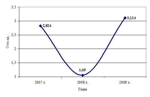 В 2009 г. положение предприятия переместилось в квадрат IV - «Рантье», характеризующийся положительным значением результирующего показателя, достигнутым благодаря резкому увеличению результата хозяйственной деятельности. Положительное значение результата хозяйственной деятельности позволило предприятию инвестировать средства в модернизацию основных фондов. Отказ от использования заемных средств привел к отрицательному значению результата финансовой деятельности.