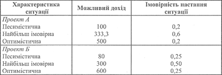 Приклад. Розглянемо два варіанти виробництва нових товарів. З огляду на невизначеність ситуації з реалізацією товарів, керівництво проаналізувало можливі доходи від реалізації проектів у різних ситуаціях (песимістична, найбільш імовірна, оптимістична), а також імовірність настання зазначених ситуацій.