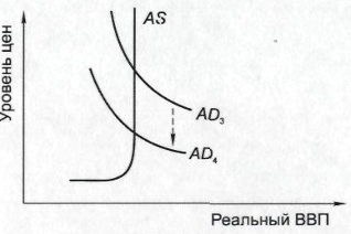 Сдерживающая фискальная политика направлена на борьбу с инфляцией спроса. В этом случае требуется устранить чрезмерный спрос на товары и услуги, который толкает цены вверх. Рисунок 2.2 демонстрирует смещение совокупного спроса из состояния AD3 в AD4 вследствие применения следующих мер: сокращения государственных расходов, повышения налогов или их сочетания.