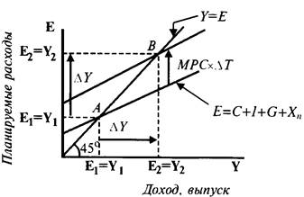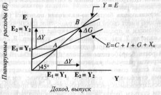 Если государственные расходы увеличиваются на ∆G, то кривая планируемых расходов сдвигается вверх на эту же величину (см. рис. 2.3), а равновесный объем производства возрастает от Y1 до Y2 на величину ∆Y = ∆G х mg, где mg - мультипликатор государственных расходов.