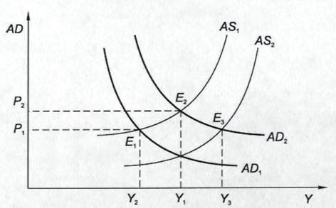 Если экономическая система находится в состоянии спада, то возникает необходимость в стимулирующей фискальной политике, прибегнув к которой правительство поощряет расходы и увеличивает реальный объем производства (ВВП). Используя модель «совокупный спрос — совокупное предложение», можно продемонстрировать смещение кривой совокупного спроса вправо (рис. 2.1). Совокупный спрос может переместиться из состояния AD1 в AD2 путем увеличения государственных расходов, снижения налогов или сочетания этих мер.