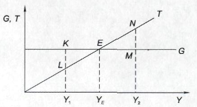 Кейнсианский крест показывает, как устанавливается равновесный объем производства Y при данном уровне планируемых инвестиций I, государственных расходов G и налоговых отчислений Т.